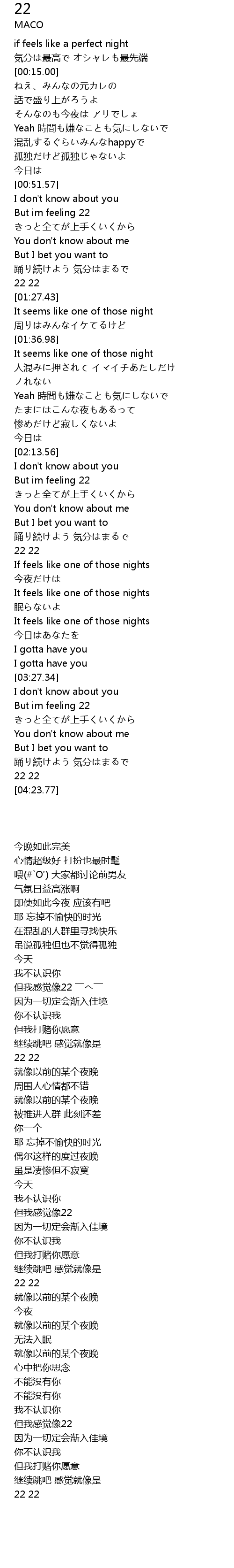 | [03:39.80] | But im feeling 22 |