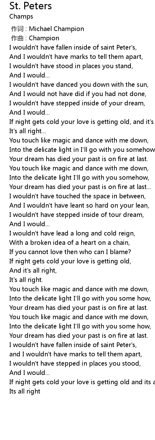 | [00:09.49] | I wouldn' t have fallen inside of saint Peter' s, |