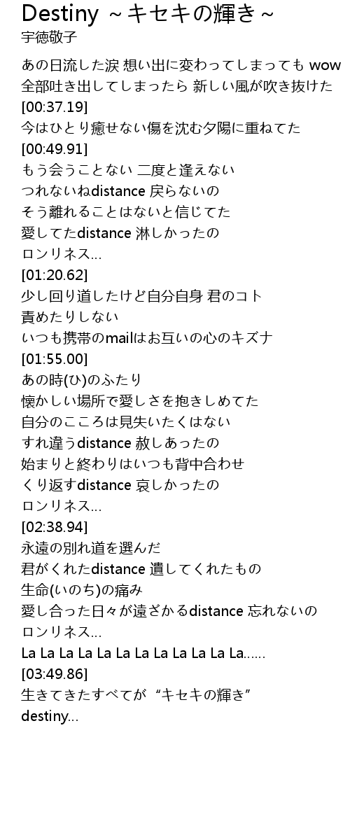 | [01:09.93] | 愛してたdistance 淋しかったの |