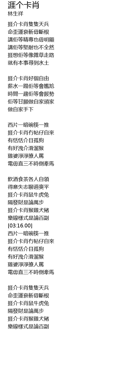 | [03:08.03] | 捱介卡肖猴雞犬豬 |