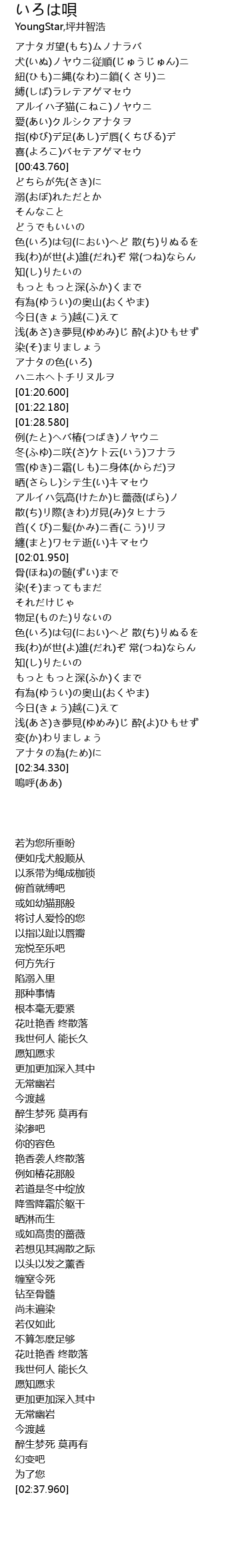 | [00:54.840] | 色(いろ)は匂(におい)へど 散(ち)りぬるを |