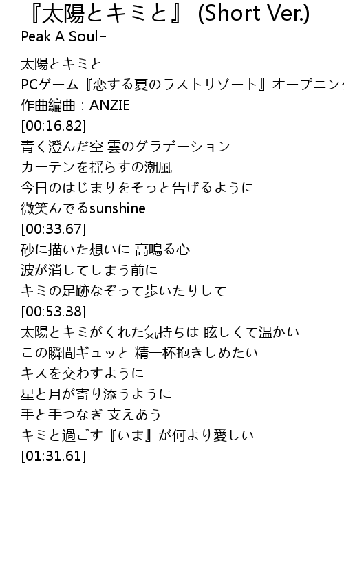 | [00:05.17] | PCゲーム『恋する夏のラストリゾート』オープニングテーマ |