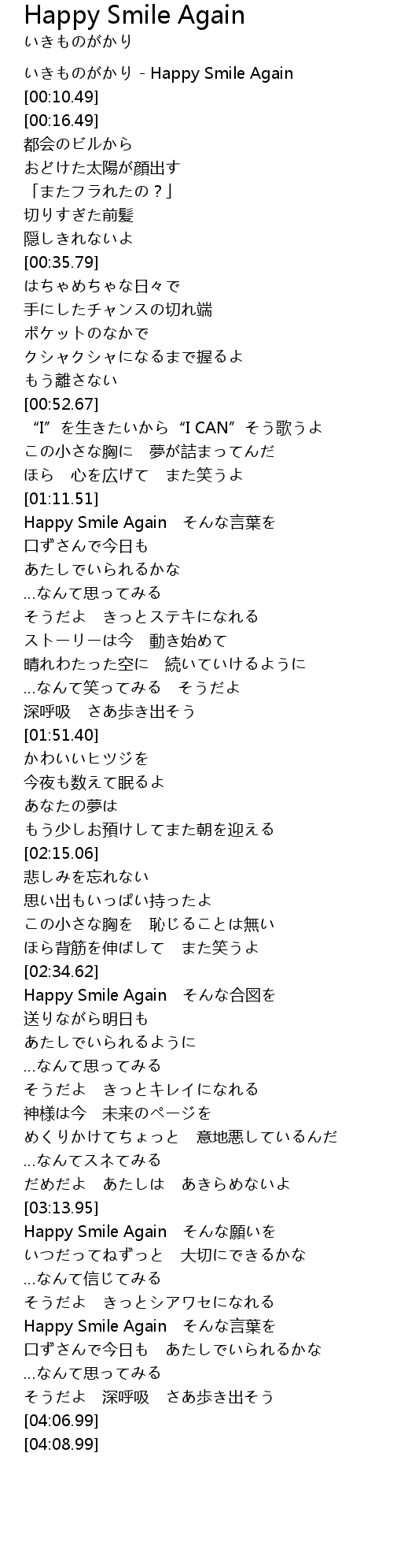 | [00:01.49] | いきものがかり - Happy Smile Again |