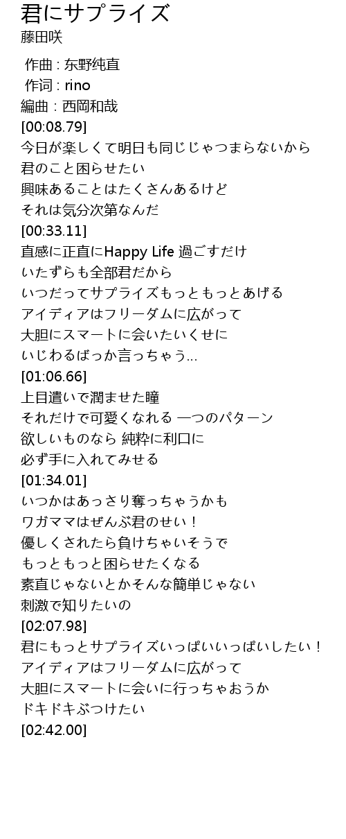 | [02:21.49] | 君にもっとサプライズいっぱいいっぱいしたい! |