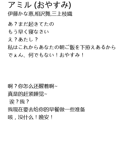 | [00:11.04] | でぇん、何でもない!おやすみ! |
