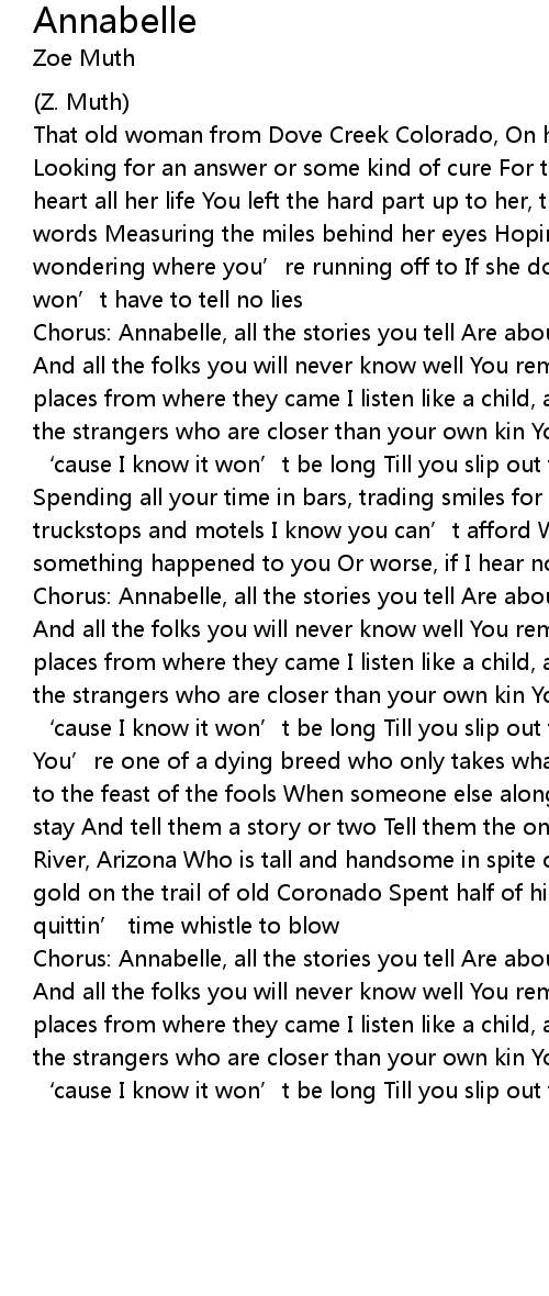 | Chorus: Annabelle, all the stories you tell Are about bus stations and trains And all the folks you will never know well You remember by the names of the places from where they came I listen like a child, as you recount the trials Of the strangers who are closer than your own kin You can leave your coat on, ‘cause I know it won’t be long Till you slip out the back door again |