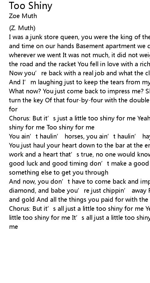| Chorus: But it' s just a little too shiny for me Yeah it' s just a little too shiny for me Too shiny for me | |