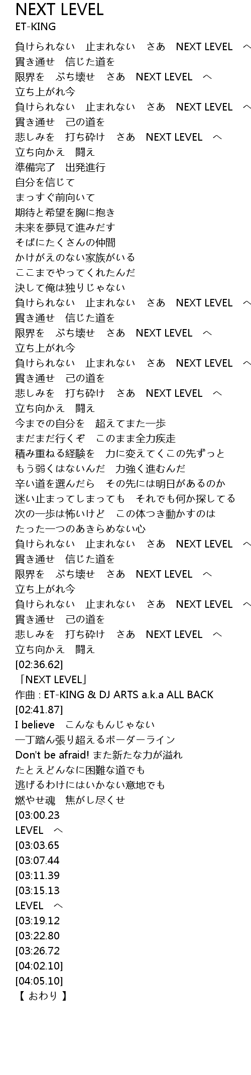 | [02:12.73] | 限界を ぶち壊せ さあ NEXT LEVEL へ |