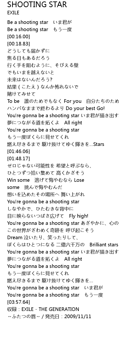 | [00:03.70] | Be a shooting star いま君が |