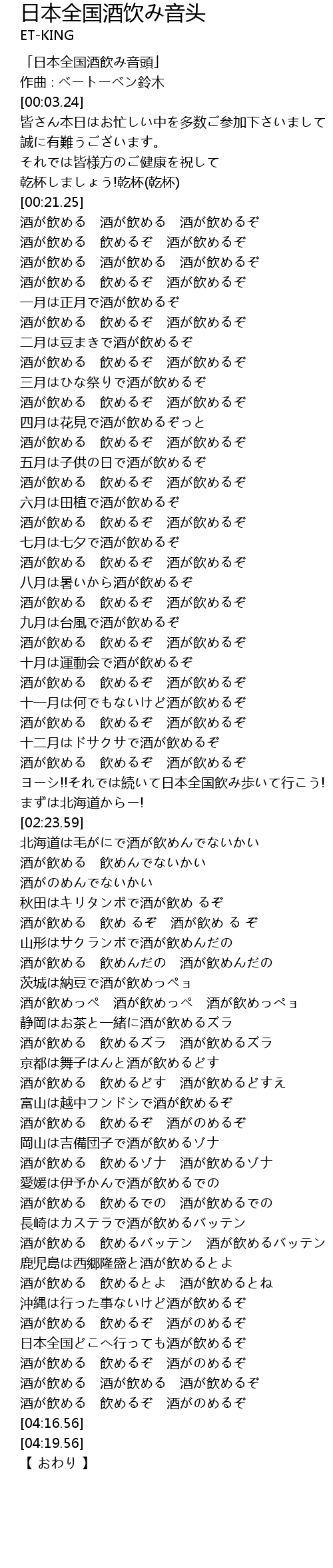 | [04:00.79] | 日本全国どこへ行っても酒が飲めるぞ |