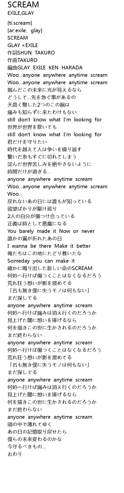 | [00:09.711] | Woo... anyone anywhere anytime scream |