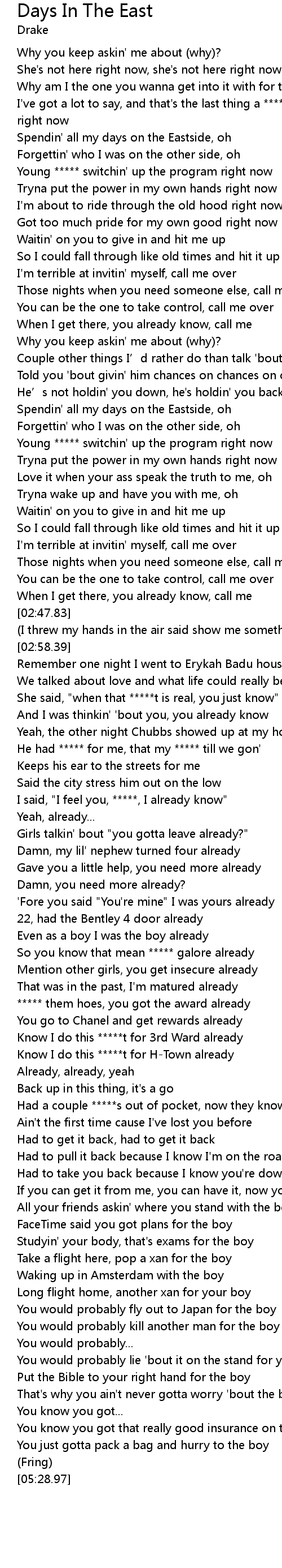 | [03:35.17] | I said, "I feel you, *****, I already know" |