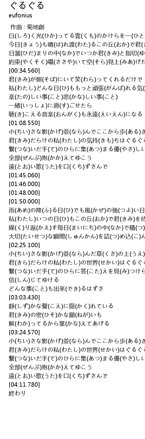 | [01:00.290] | 聴(き)こえる音楽(おんがく)も永遠(えいえん)になる |