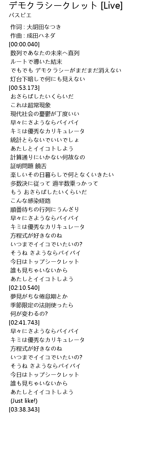| [00:41.654] | でもでも デモクラシーがまだまだ消えない |