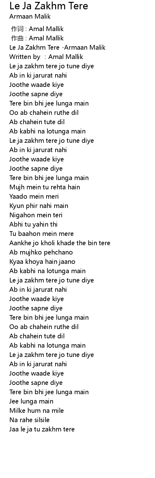 | [00:00.38] | Le Ja Zakhm Tere -Armaan Malik |