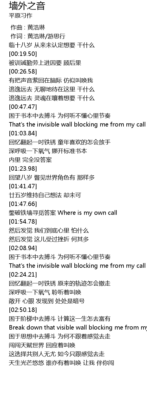 | [01:48.30] | 鐅破铁墙寻觅答案 Where is my own call |