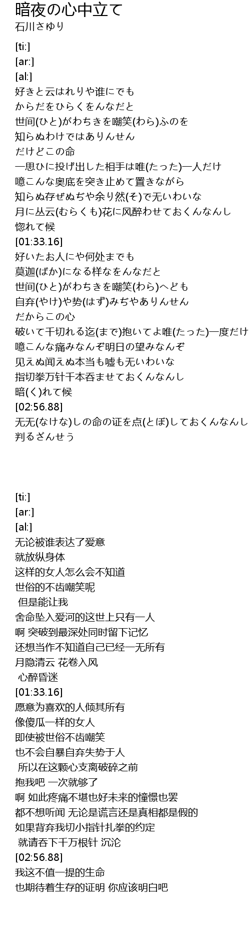 | [00:53.74] | 一思ひに投げ出した相手は唯(たった)一人だけ |