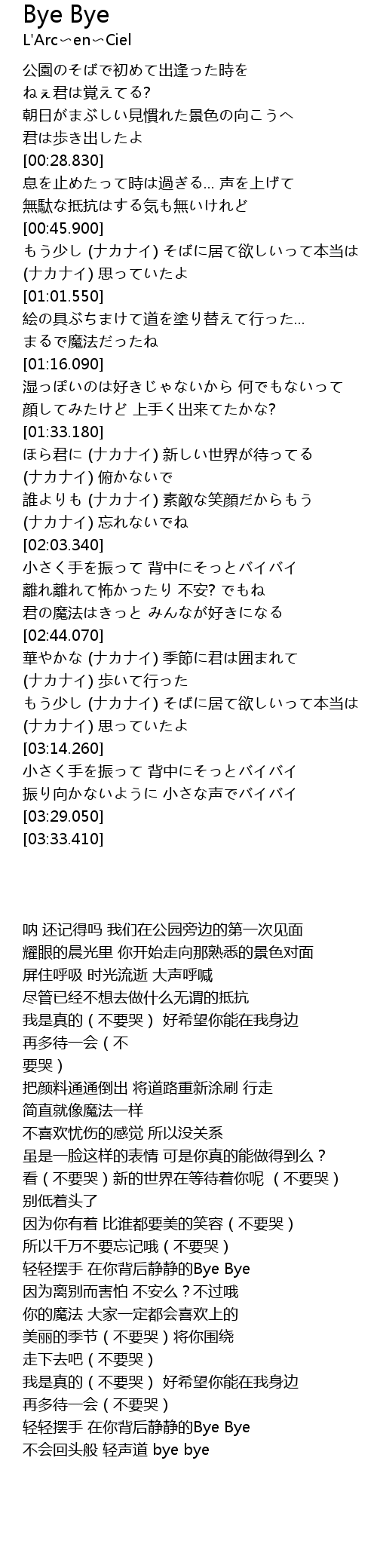 | [02:59.730] | もう少し (ナカナイ) そばに居て欲しいって本当は (ナカナイ) 思っていたよ |