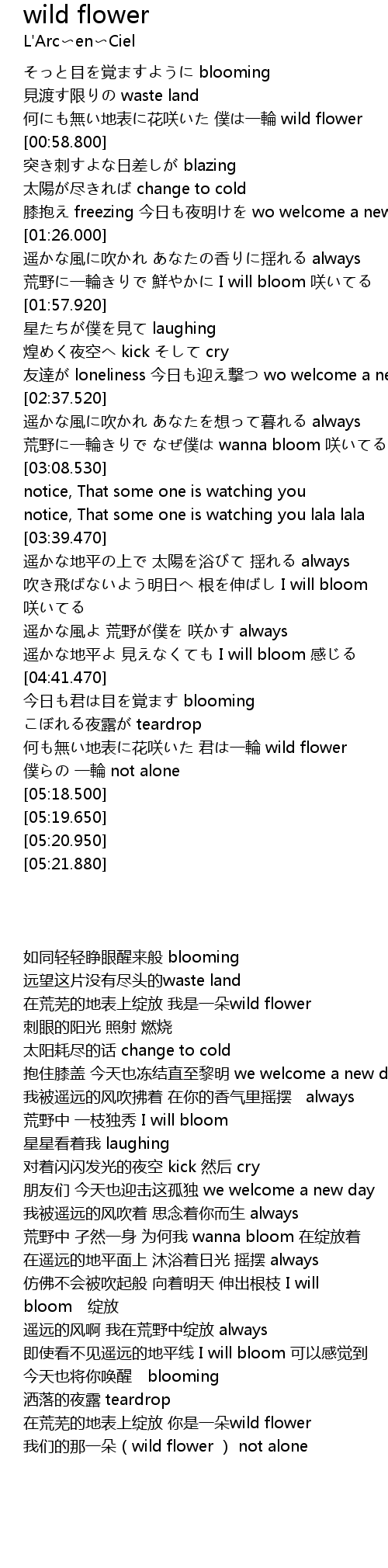 | [00:46.320] | 何にも無い地表に花咲いた 僕は一輪 wild flower |