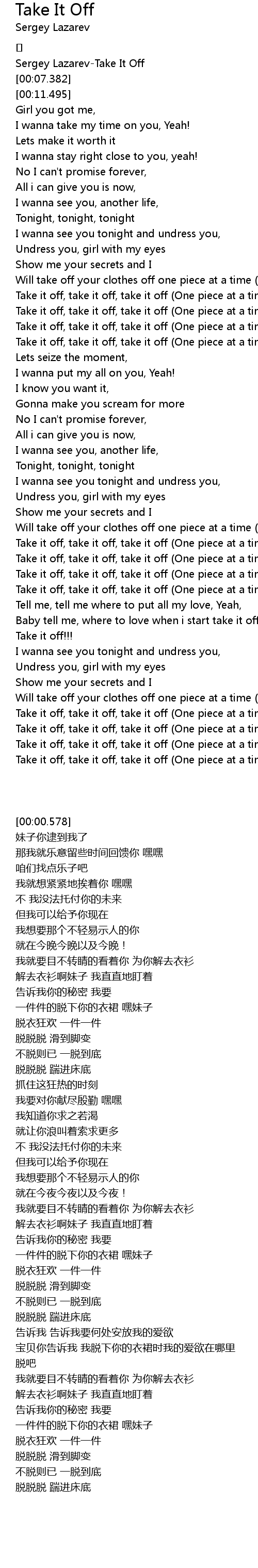 | [03:20.36] | Take it off, take it off, take it off (One piece at a time) |