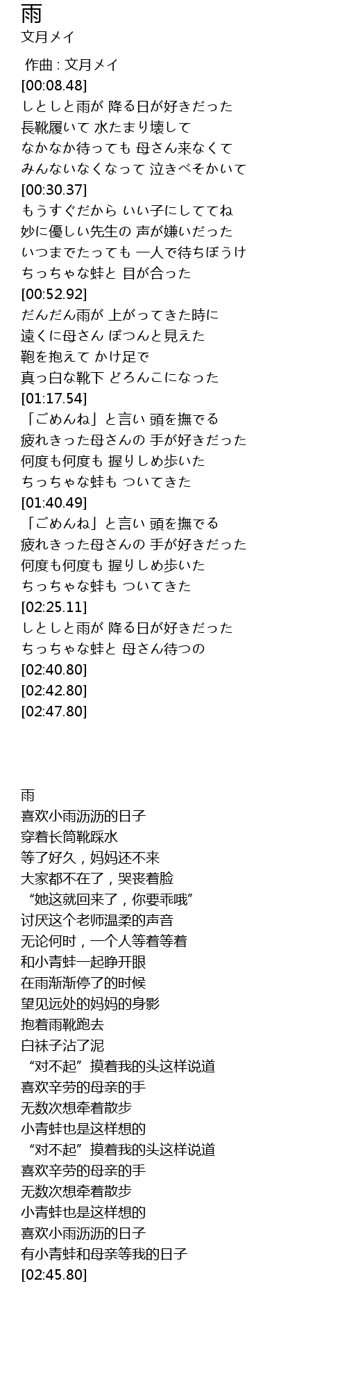 | [02:34.35] | ちっちゃな蛙と 母さん待つの |