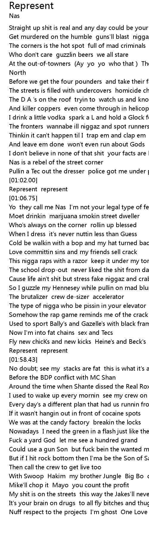 | [01:12.49] | Yo they call me Nas I'm not your legal type of fella |