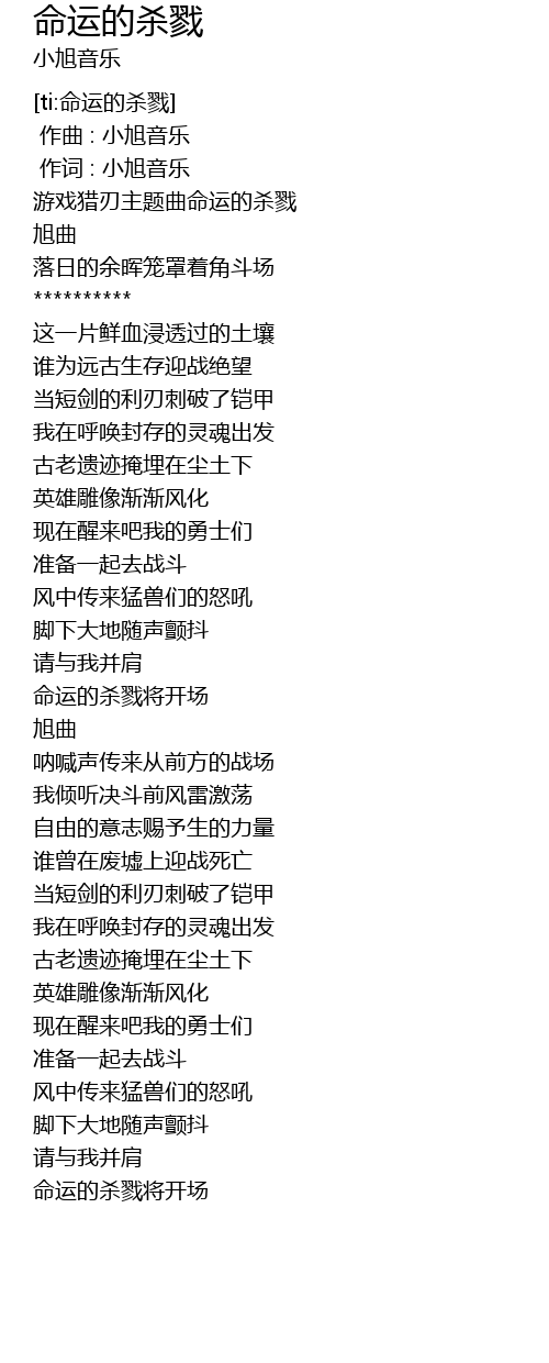 | [00:02.07] | 游戏猎刃主题曲命运的杀戮 |