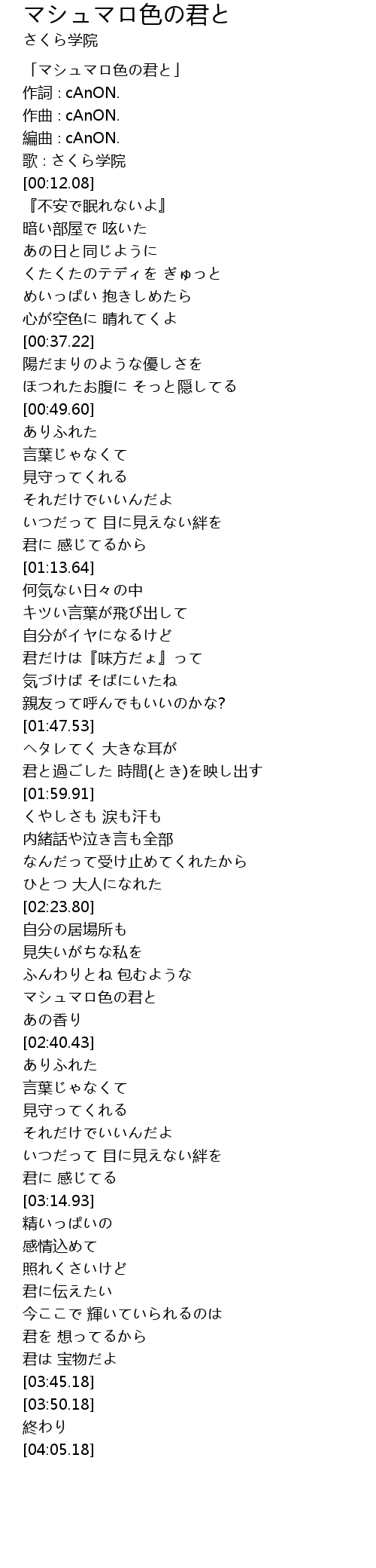 | [00:00.08] | 「マシュマロ色の君と」 |