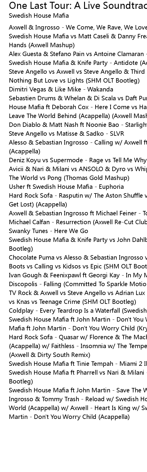 Swedish House Mafia ft John Martin - Save The World (OLT Edit) w/ Sebastian Ingrosso & Tommy Trash - Reload w/ Swedish House Mafia ft John Martin - Save The World (Acappella) w/ Axwell - Heart Is King w/ Swedish House Mafia ft John Martin - Don't You Worry Child (Acappella) |