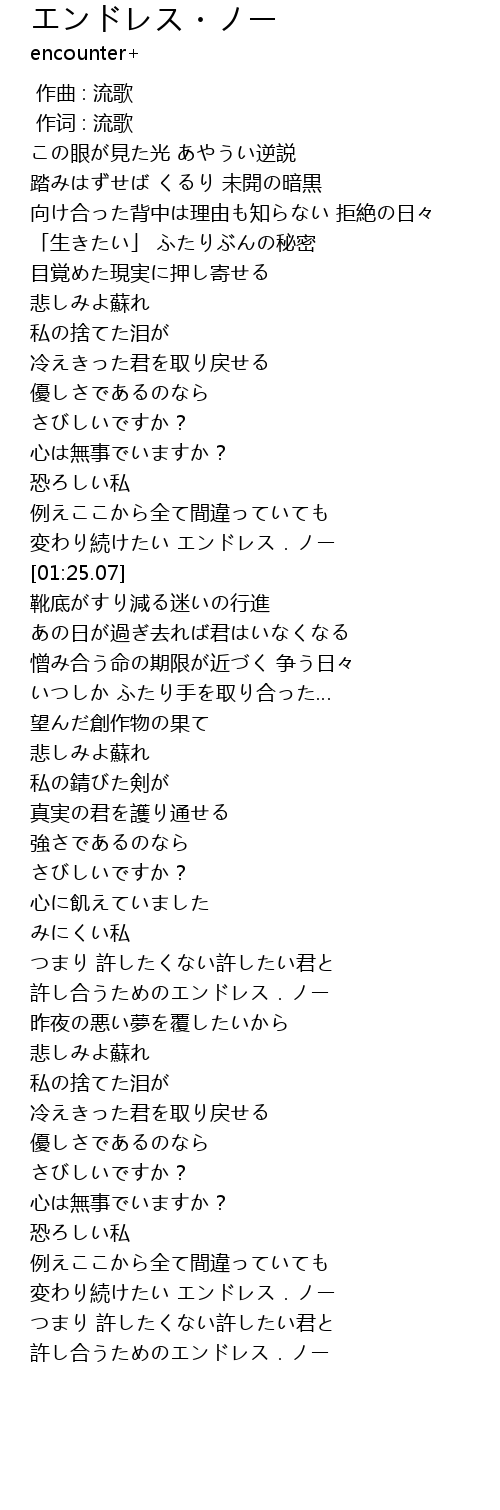 | [01:16.13] | 変わり続けたい エンドレス.ノー |