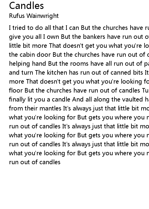 I tried to do all that I can But the churches have run out of candles I tried to give you all I own But the bankers have run out of loaners It's always just that little bit more That doesn't get you what you're looking for I tried to block the cabin door But the churches have run out of candles I tried to lend a helping hand But the rooms have all run out of pamphlets I tried to cook it up and turn The kitchen has run out of canned bits It's always just that little bit more That doesn't get you what you're looking for I tried a beggin on the cabin floor But the churches have run out of candles Turn one day in the cathedral I finally lit you a candle And all along the vaulted halls The virgins did smile from their mantles It's always just that little bit more That doesn't get you what you're looking for But gets you where you need to go But the churches have run out of candles It's always just that little bit more That doesn't get you what you're looking for But gets you where you need to go But the churches have run out of candles It's always just that little bit more That doesn't get you what you're looking for But gets you where you need to go But the churches have run out of candles