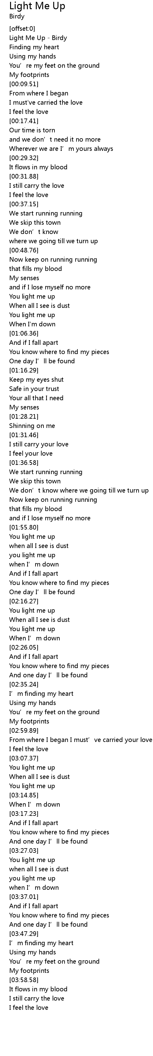 | [00:00.71] | Light Me Up - Birdy |