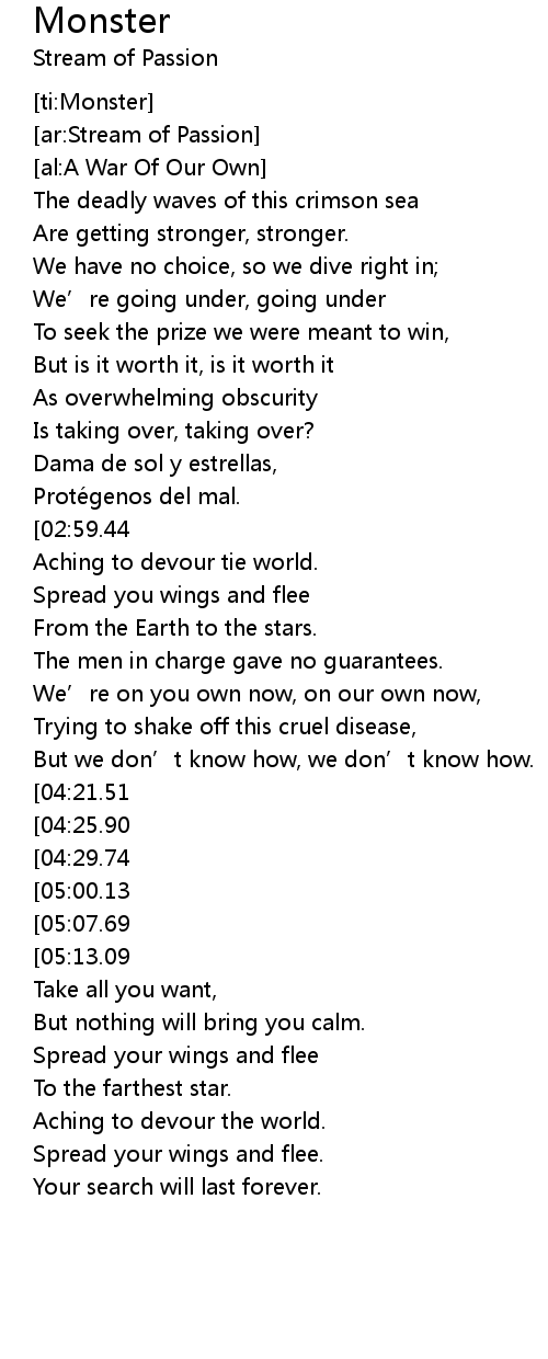 | [01:44.07][02:59.44][04:38.47][04:54.89] | You' ve become a monster |