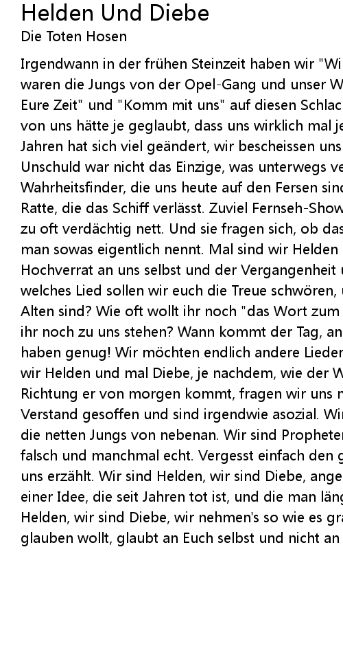 | Irgendwann in der frü hen Steinzeit haben wir " Wir sind bereit" geschrien. Wir waren die Jungs von der OpelGang und unser Weg war noch das Ziel. " Verschwendet Eure Zeit" und " Komm mit uns" auf diesen Schlachtruf waren wir stolz. Und keiner von uns h tte je geglaubt, dass uns wirklich mal jemand folgt. In all den Jahren hat sich viel ge ndert, wir bescheissen uns da nicht selbst. Unsre Unschuld war nicht das Einzige, was unterwegs verloren ging. Die selbsternannten Wahrheitsfinder, die uns heute auf den Fersen sind, suchen den Spion in uns, die Ratte, die das Schiff verl sst. Zuviel FernsehShows, zuviel Interviews, viel zu oft verd chtig nett. Und sie fragen sich, ob das noch Punkrock ist, oder wie man sowas eigentlich nennt. Mal sind wir Helden und mal Diebe, angeklagt wegen Hochverrat an uns selbst und der Vergangenheit und dem, was wir mal war' n. Auf welches Lied sollen wir euch die Treue schw ren, und dass wir noch immer die Alten sind? Wie oft wollt ihr noch " das Wort zum Sonntag" h ren? Wie lang wollt ihr noch zu uns stehen? Wann kommt der Tag, an dem ihr ruft: " Es reicht, wir haben genug! Wir m chten endlich andere Lieder und eure Zeit ist um."? Mal sind wir Helden und mal Diebe, je nachdem, wie der Wind sich dreht. Aus welcher Richtung er von morgen kommt, fragen wir uns nicht. Wir haben uns um den Verstand gesoffen und sind irgendwie asozial. Wir sind h flich und bescheiden, die netten Jungs von nebenan. Wir sind Propheten, wir sind Lü gner, mal sind wir falsch und manchmal echt. Vergesst einfach den ganzen Mist, den man sich ü ber uns erz hlt. Wir sind Helden, wir sind Diebe, angeklagt wegen Hochverrat an einer Idee, die seit Jahren tot ist, und die man l ngst beerdigt hat. Wir sind Helden, wir sind Diebe, wir nehmen' s so wie es grad kommt. Und wenn ihr an etwas glauben wollt, glaubt an Euch selbst und nicht an uns. |