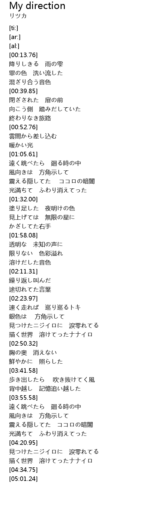 | [01:12.44] | 風向きは 方角示して |