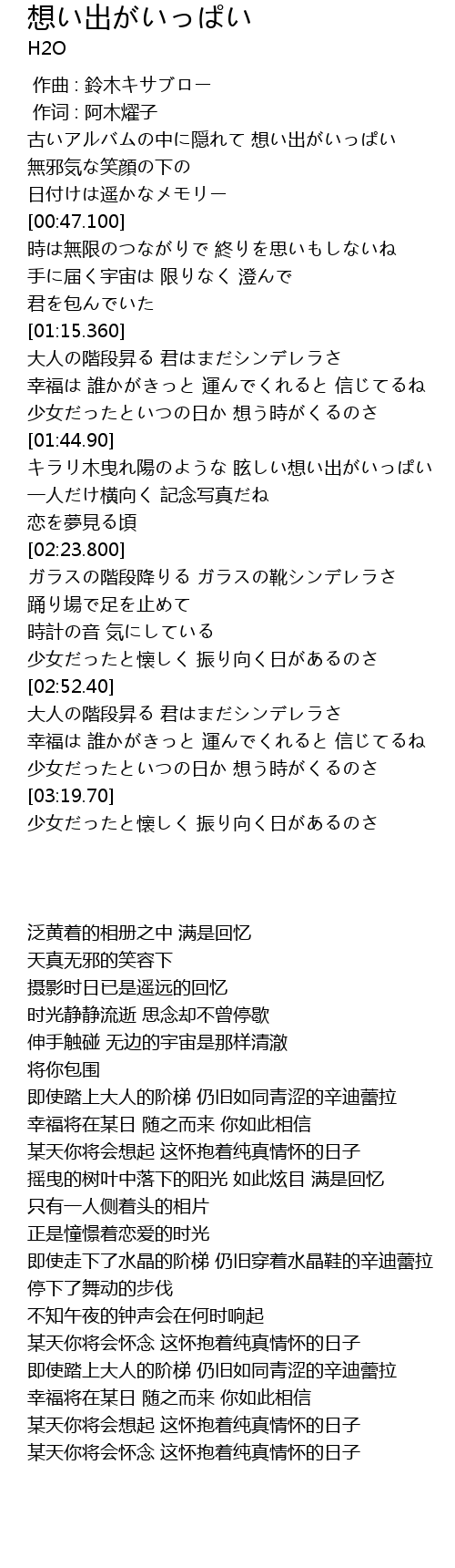 | [01:58.300] | キラリ木曳れ陽のような 眩しい想い出がいっぱい |