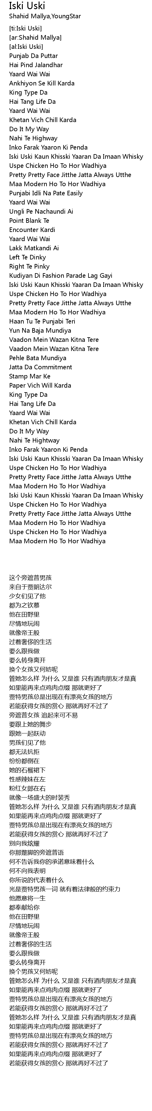 | [00:57.00] | Iski Uski Kaun Khisski Yaaran Da Imaan Whisky |