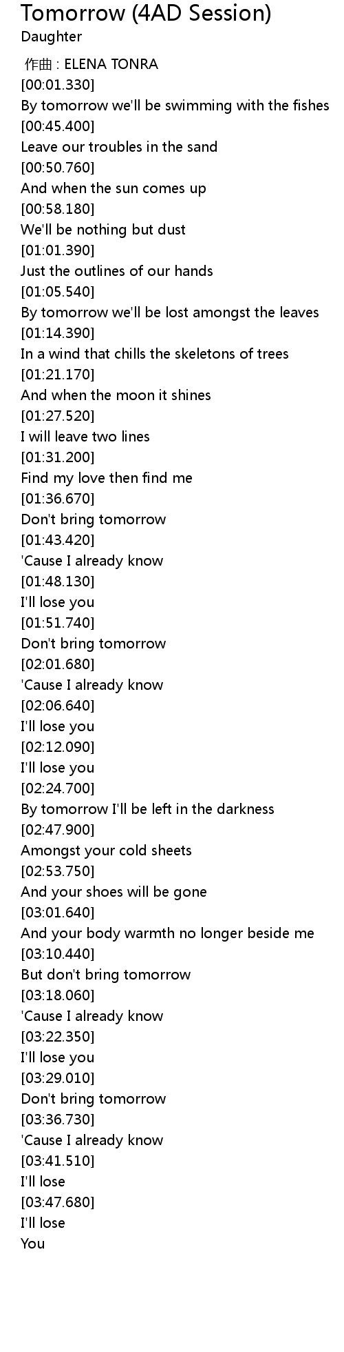 | [03:14.250] | But don't bring tomorrow |