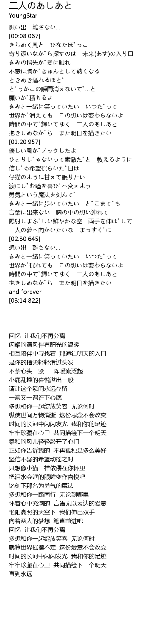 | [02:58.023] | 時間の中で輝いてゆく 二人のあしあと |