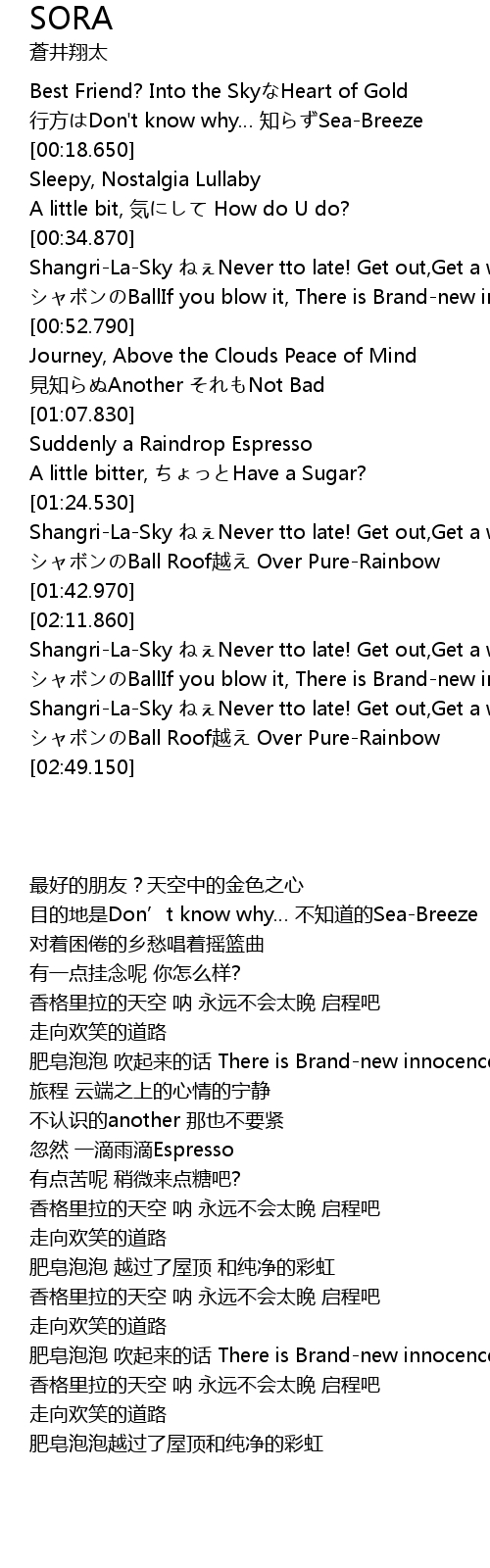 | [02:31.730] | ShangriLaSky Never tto late! Get out, Get a way, Laugh away |