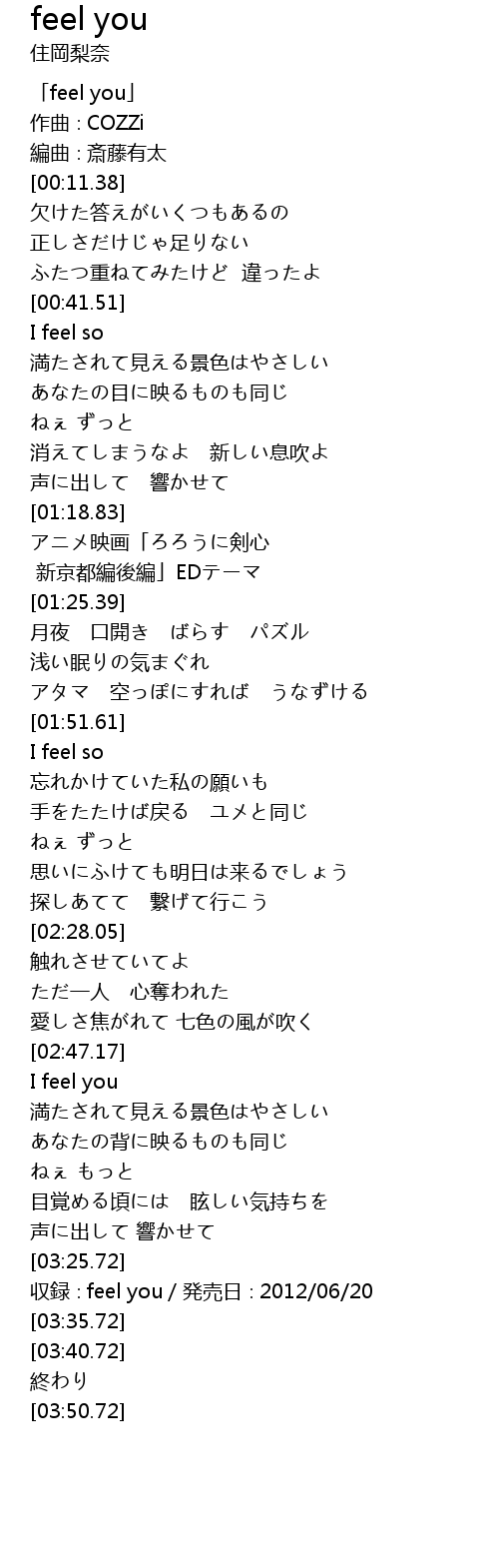 | [03:30.72] | 収録∶feel you/発売日∶2012/06/20 |