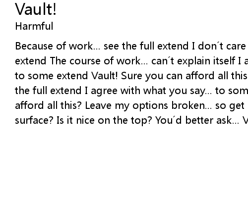 | Because of work... see the full extend I don´t care what you say... to some extend The course of work... can´t explain itself I agree with what you say... to some extend Vault! Sure you can afford all this? Leave my options broken See the full extend I agree with what you say... to some extend Vault! Sure you can afford all this? Leave my options broken... so get out Vault! Is it nice on the surface? Is it nice on the top? You´d better ask... Vault! |