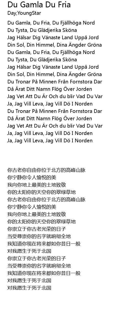 | [00:46.25] | Du Gamla, Du Fria, Du Fj llh ga Nord |