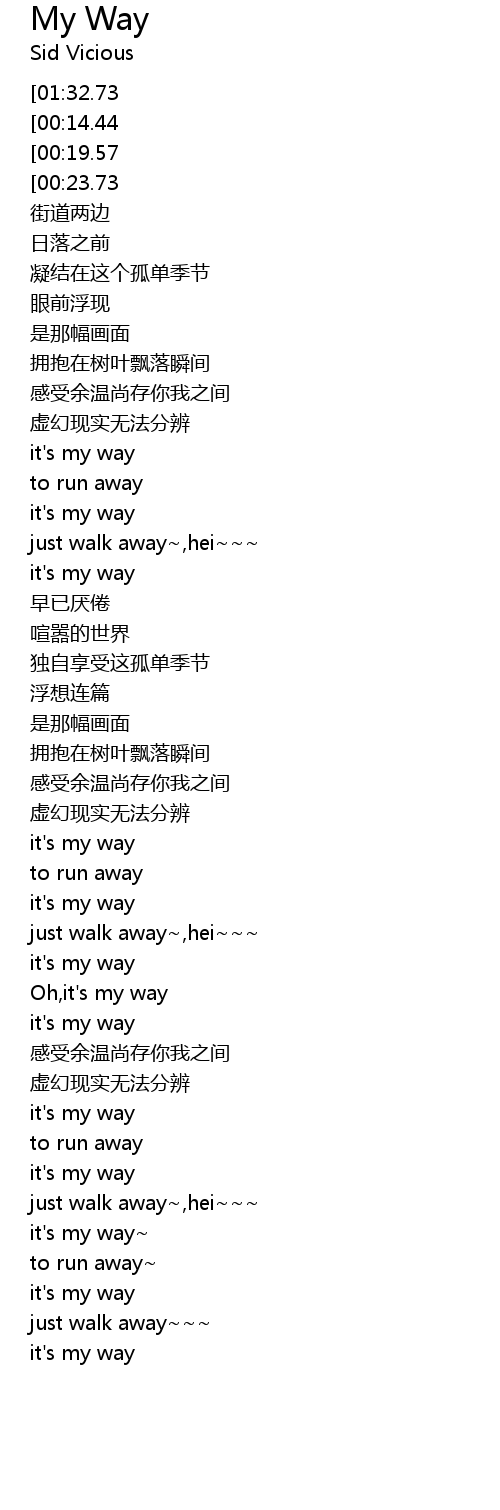 | [03:07.99][01:32.73][00:09.19] | my way |