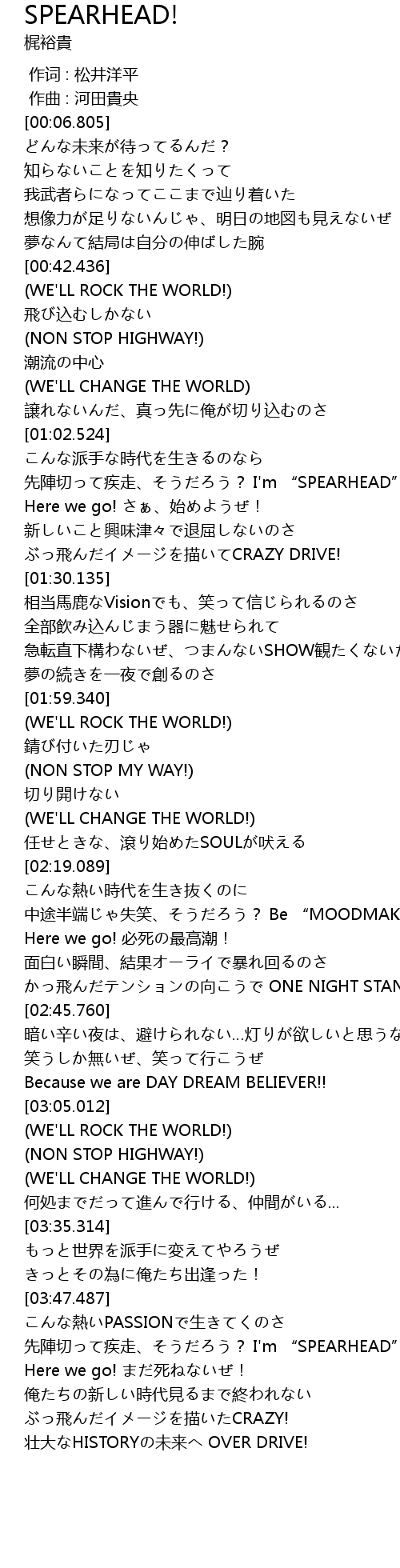 | [03:52.764] | 先陣切って疾走、そうだろう? I'm “SPEARHEAD”! |