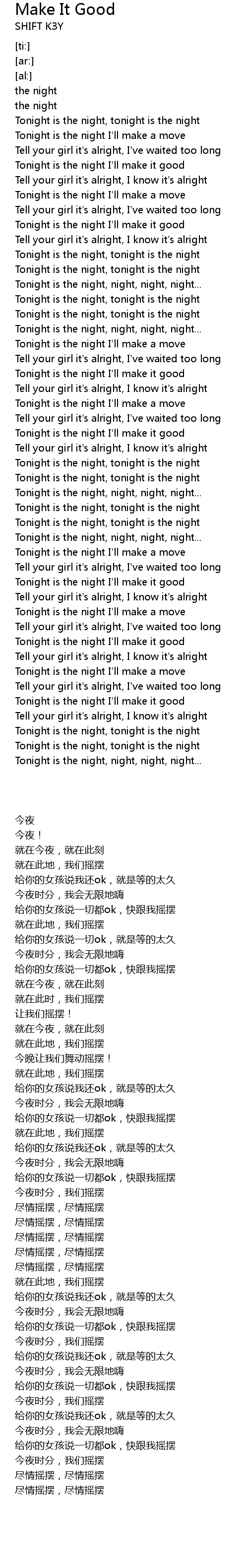 | [04:21.63] | Tell your girl it's alright, I know it's alright |