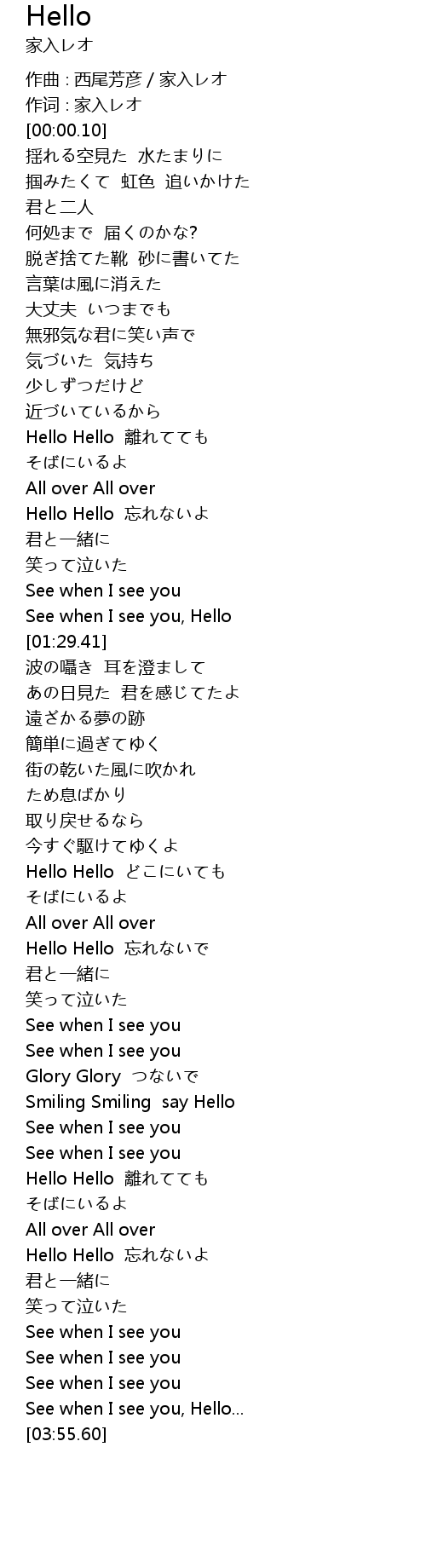 | [00:00.00] | 作曲∶西尾芳彦/家入レオ |