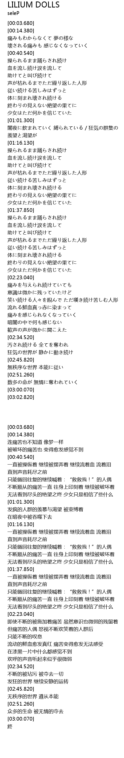 | [02:14.910] | 助けてと叫び続けて 声が枯れるまでただ繰り返した人形 |