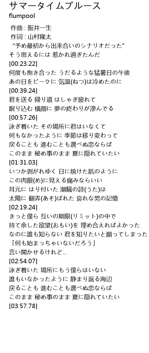 | [03:47.53] | このまま 秘め事のまま 夏に隠れていたい |