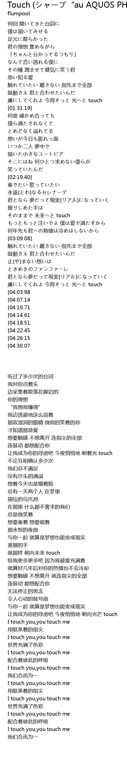 | [03:54.64] | 虜にしてくれよ 今宵そっと 光へと touch |